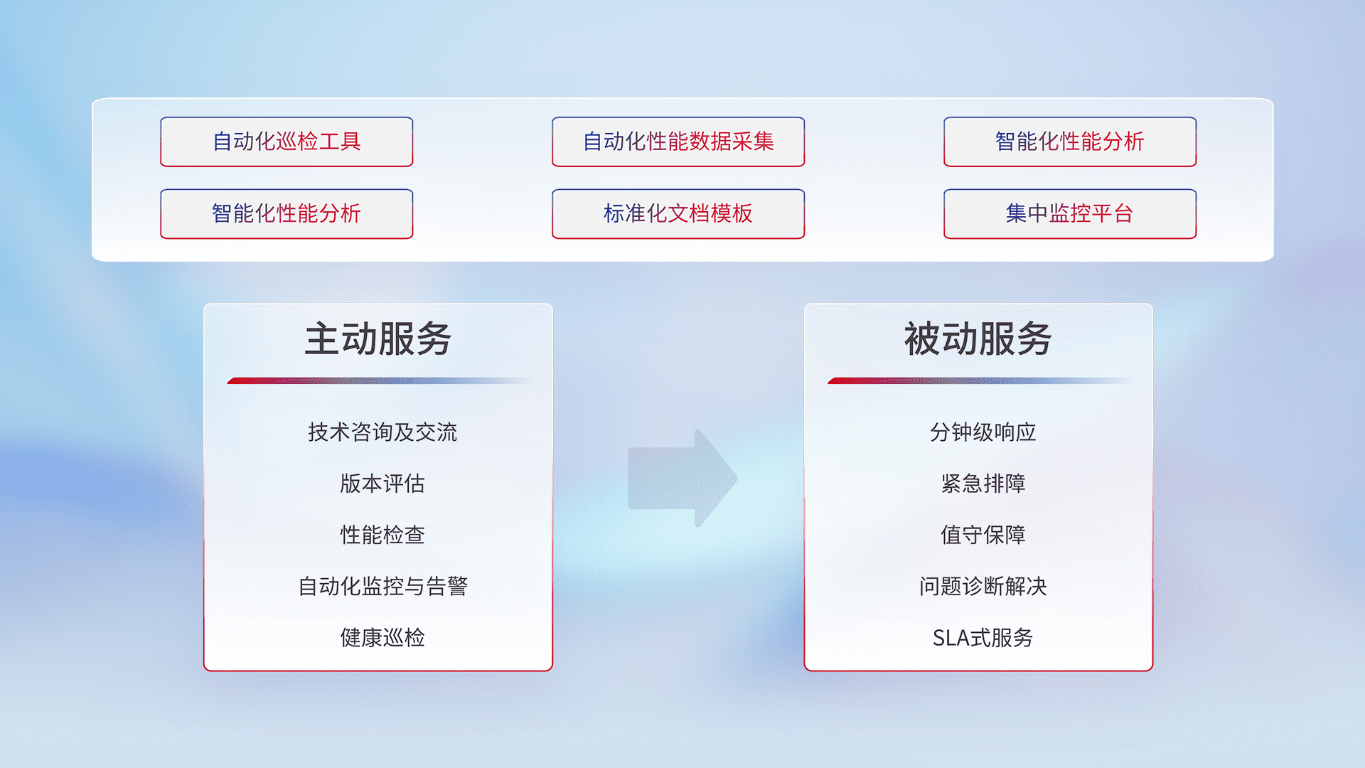 智能化工具和标准化文档,,保障服务质量,,提供主动服务(包含技术咨询、、版本评估、、、、性能检查、、自动化监控与告警、、、健康巡检)和被动服务包含(分钟级响应、、、紧急排障、、、、值守保障、、、问题诊断解决、、SLA服务)。。。。